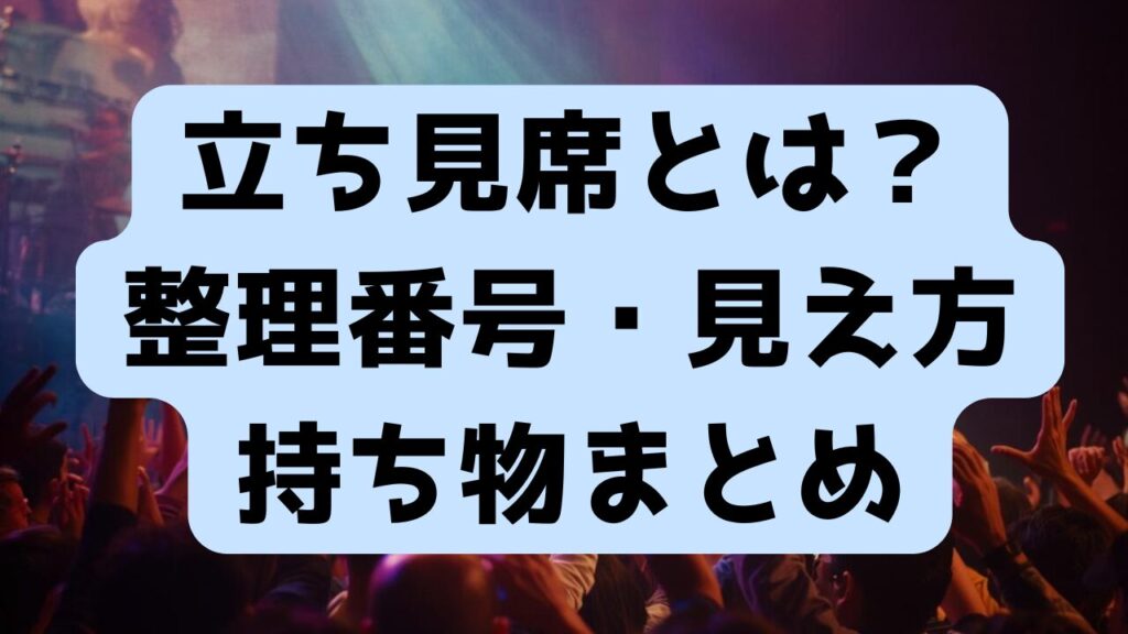 ライブの立ち見席について、整理番号の仕組み、見え方、きつさ、持ち物、会場ごとの違いまでまとめました。横浜アリーナ・大阪城ホール・真駒内など立ち見の仕組みをわかりやすく解説します。初めて立ち見席になった方にもわかりやすい完全ガイドです。